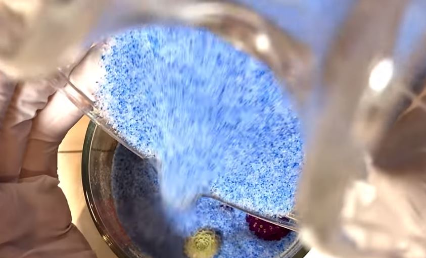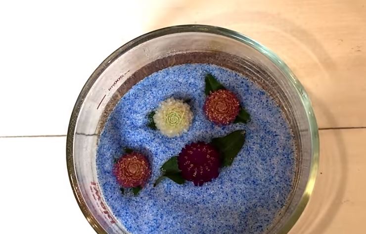 耐熱ボウルにシリカゲルを入れたら、お花が重ならないように埋めていきます